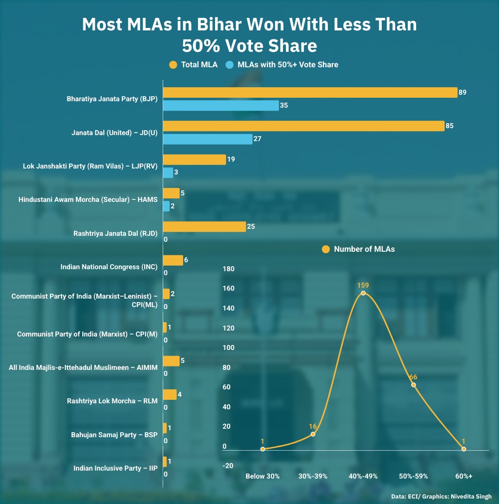 In total, MLAs from only four parties managed to get the 50 per cent-plus vote share in their respective seats—three from Lok Janshakti Party (Ram Vilas)(LJPRV) and two from Hindustani Awam Morcha (Secular) (HAMS).