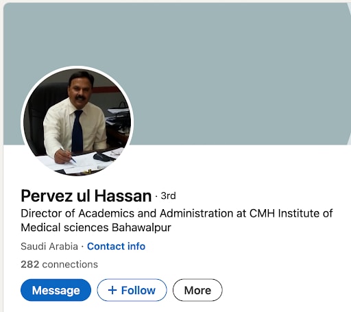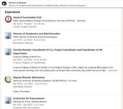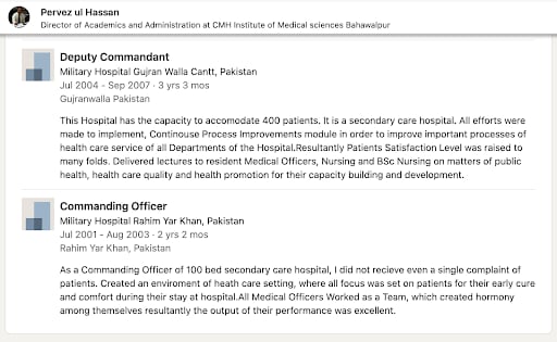 As per his publicly available LinkedIn profile, Pervez ul Hassan has been Head of the Examination Cell at CMH (Combined Military Hospital) Lahore Medical College, operated by the Pakistan Army, since 2022. Before that, he served for five years, from June 2017 to July 2022, as Director of Academics and Administration at the CMH Institute of Medical Sciences (CIMS), Bahawalpur, which, according to its official website, is among the “medical colleges being run under the dependable patronage of Pakistan Army."