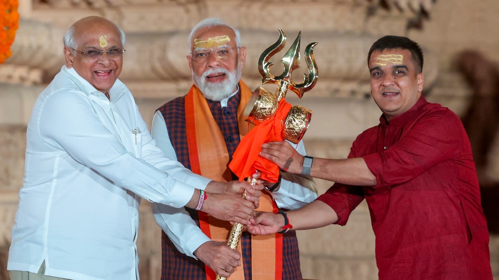 PM Modi, Gujarat Chief Minister Bhupendra Patel and Deputy CM Harsh Sanghavi hold a 'trishul' during Somnath Swabhiman Parv. (PMO)