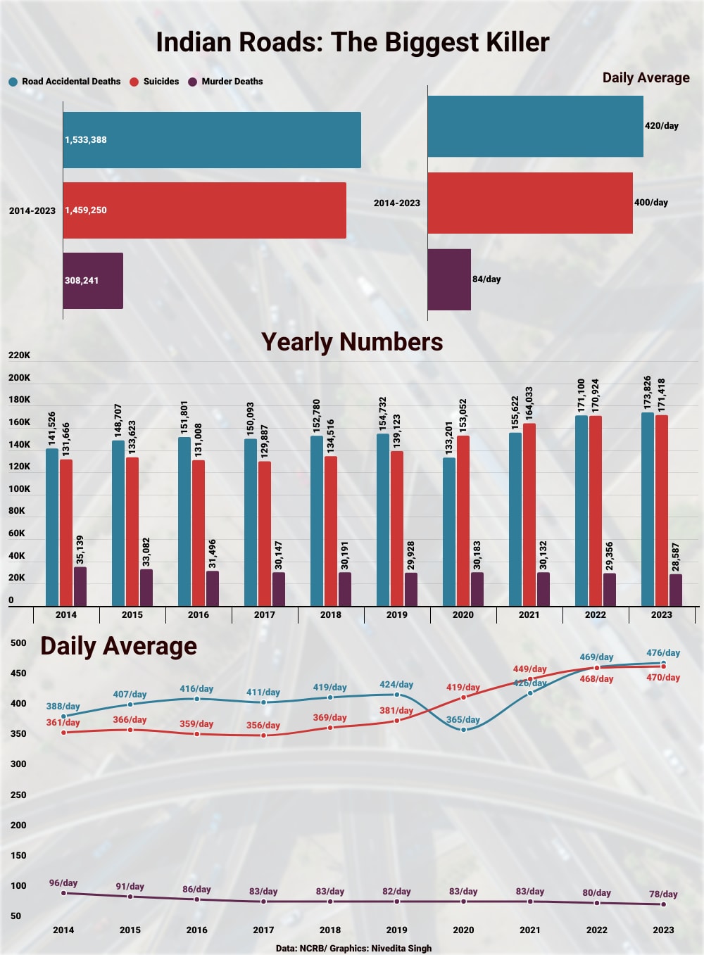 Between 2014 and 2023, India lost an average of 420 people every day to road accidents---higher than the suicide toll (400) and murder victims (84)
