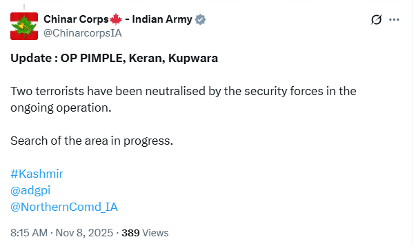 Two terrorists have been killed by security forces in the ongoing operation in the Keran area of Kupwara district, Jammu and Kashmir.