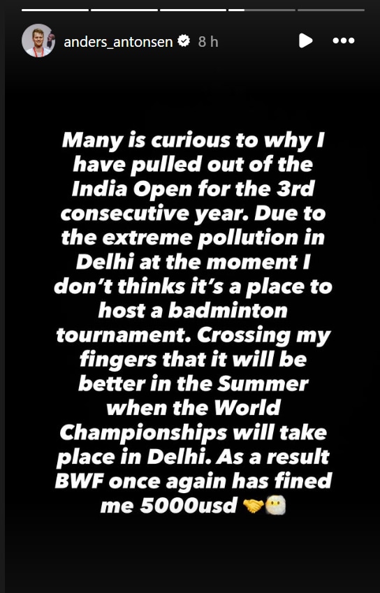 In an Instagram story post, Antonsen revealed that Delhi’s severe pollution was the main reason for his withdrawal from the tournament, adding that the world badminton body had fined him USD 5,000 for pulling out.