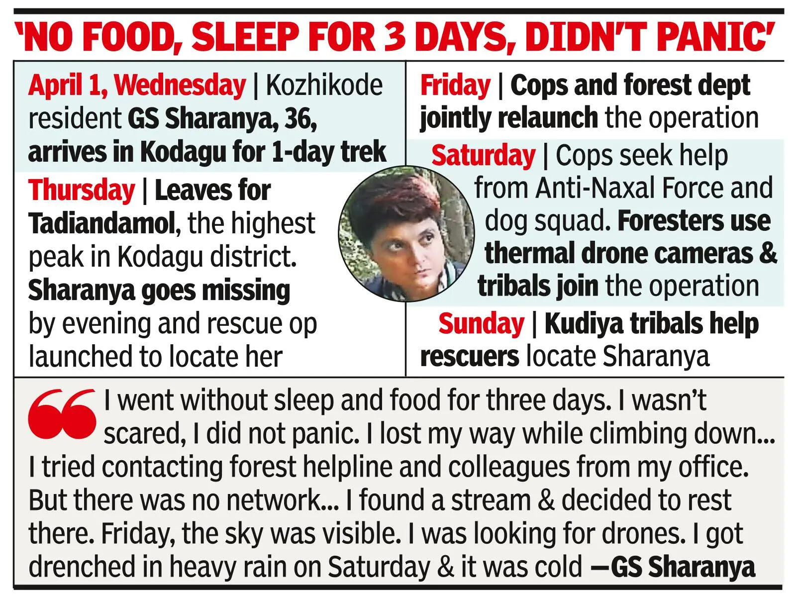 MADIKERI: More than 72 hours after she lost her way while descending Tadiandamol, the highest peak in Kodagu district, Kerala's GS Sharanya, 36, was traced to Pattighat reserve range Sunday.Immediately after she got separated from other trekkers Thursday, Sharanya took shelter in an abandoned shack atop the peak. Since she wasn't confident of climbing down without assistance, she stayed put in the same region on Friday and Saturday, battling extreme weather, hunger, and uncertainties in a terrain home to wild animals.She was found by tribal community members around 4pm Sunday. Virajpet MLA AS Ponnanna, legal adviser to the CM, told TOI that he rushed to Tadiandamol and interacted with Sharanya.Police and govt sources said nine teams conducted the operation in close coordination, with foresters bringing in sophisticated thermal drone cameras to sharpen the search for the missing trekker.