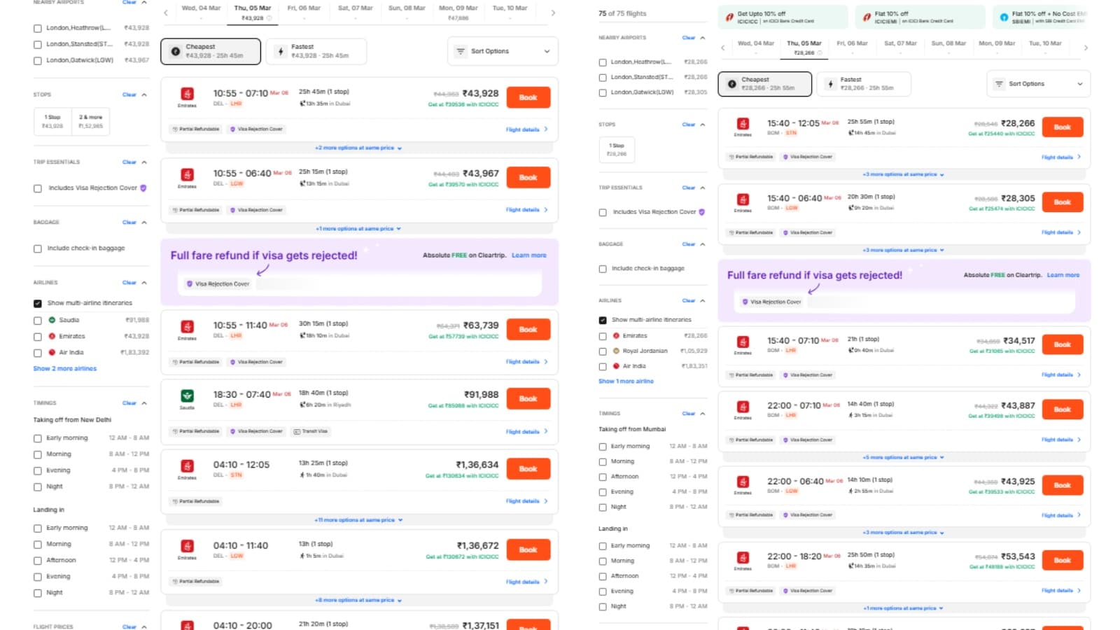 On the Mumbai to London route, too, direct flights are missing. One-stop Emirates flights via Dubai start from about Rs 28,266 with travel times close to 26 hours, while other connections range above Rs 30,000 depending on the airport of arrival and layover duration. Some itineraries extend beyond 30 hours, reflecting the routing challenges passengers now face.