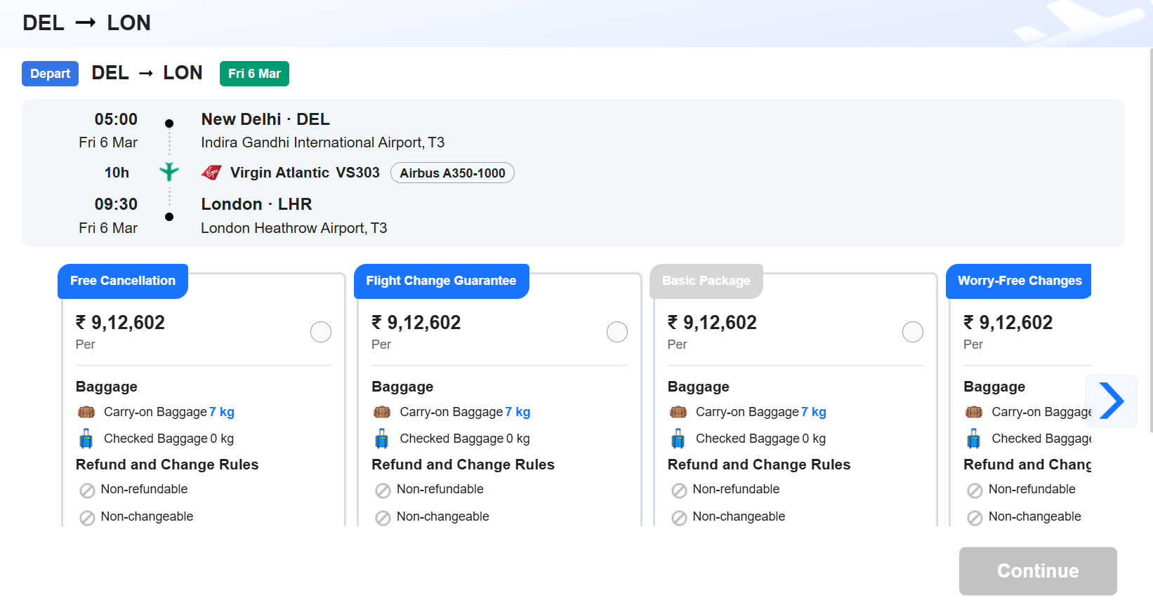 For departure on March 6 from New Delhi to London Heathrow, the only direct service available is Virgin Atlantic VS303 (Airbus A350-1000), scheduled to leave at 5 am and reach London by 09:30 after a 10-hour flight, but it carries a hefty fare of ₹9 lakh one-way. All other viable options require at least one stop, mostly via Dubai, with the best priced at Rs 43,928 for flights lasting around 25 hours and 45 minutes.