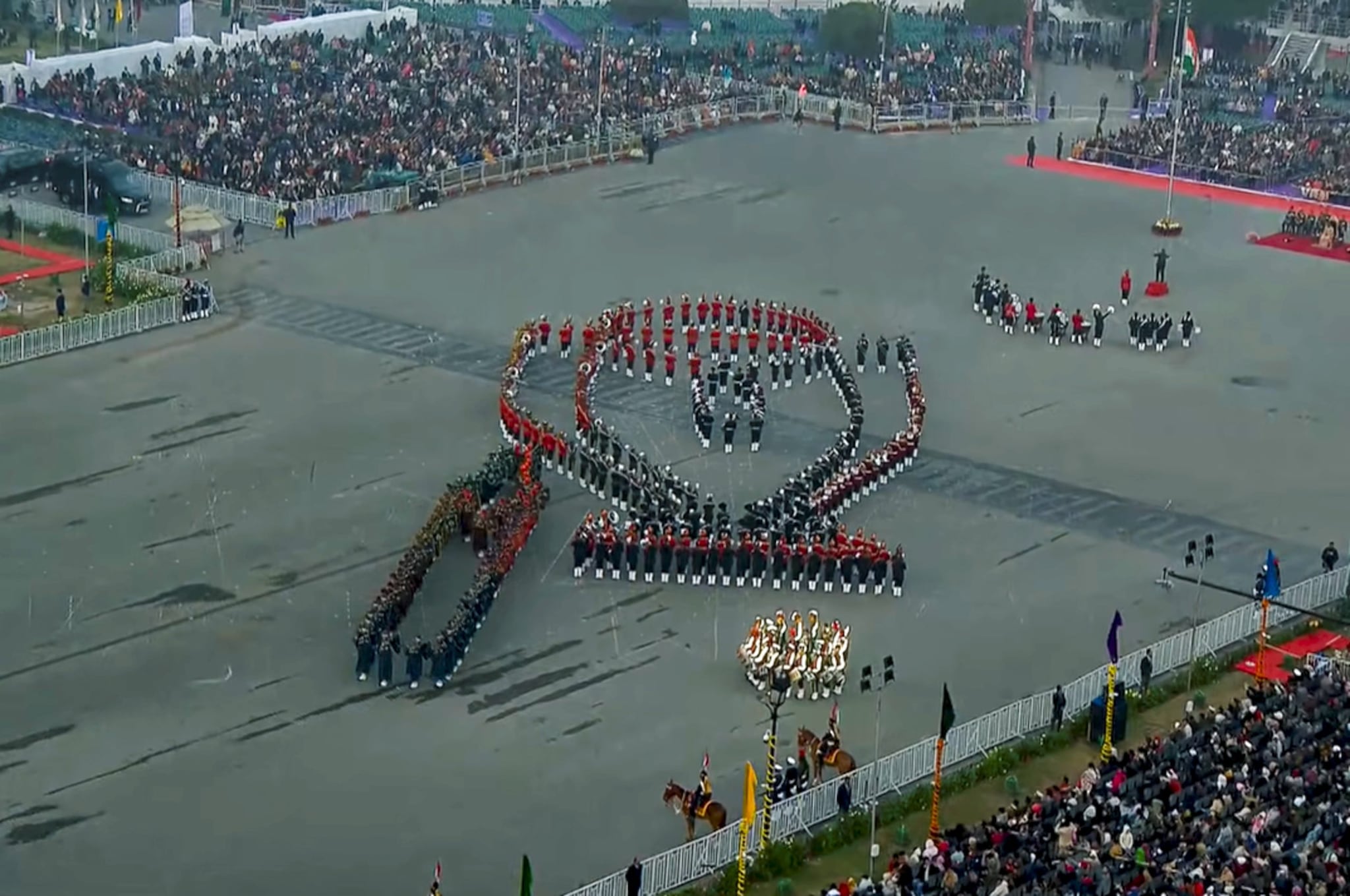 Armed forces personnel form a 'Sindoor' formation during the Beating Retreat ceremony.