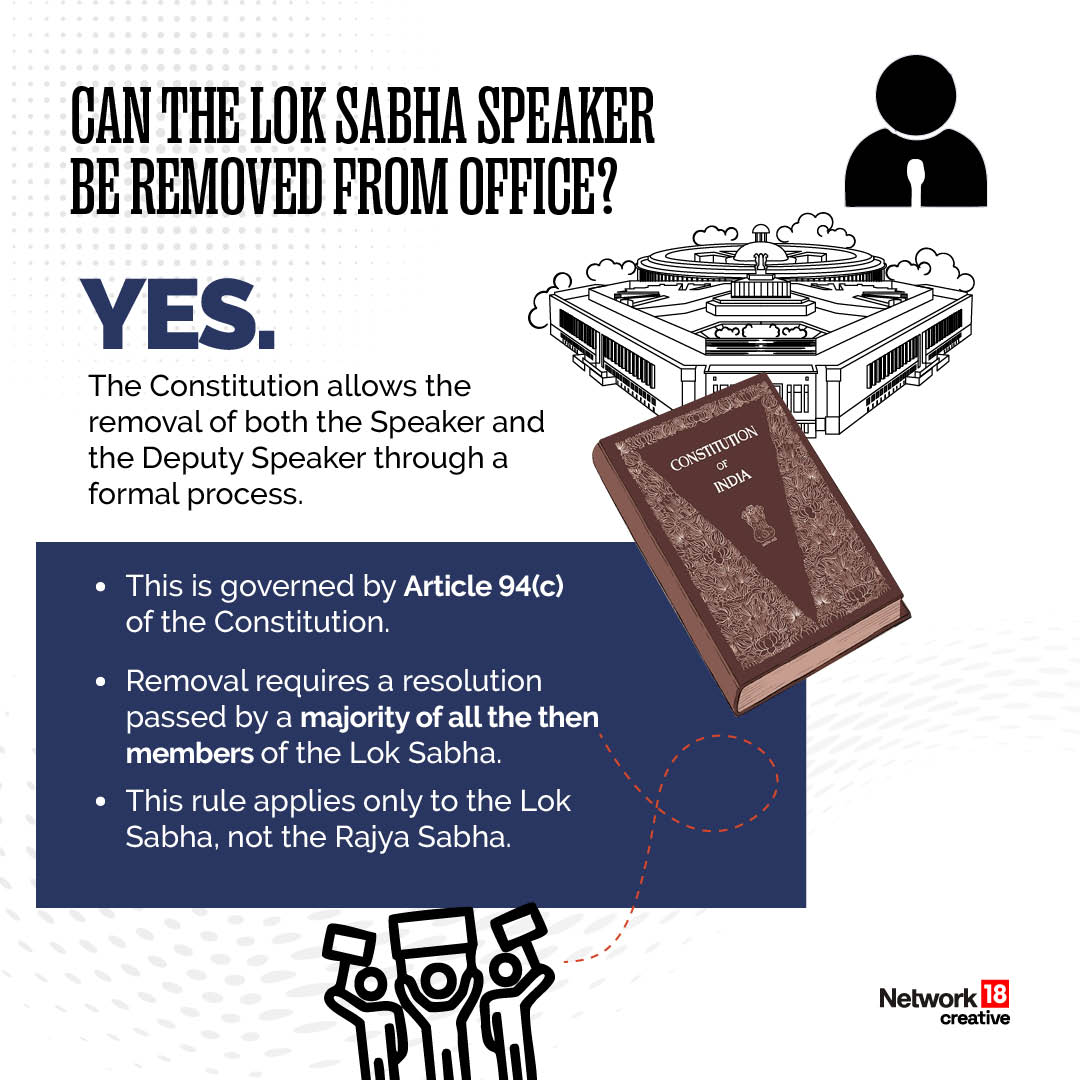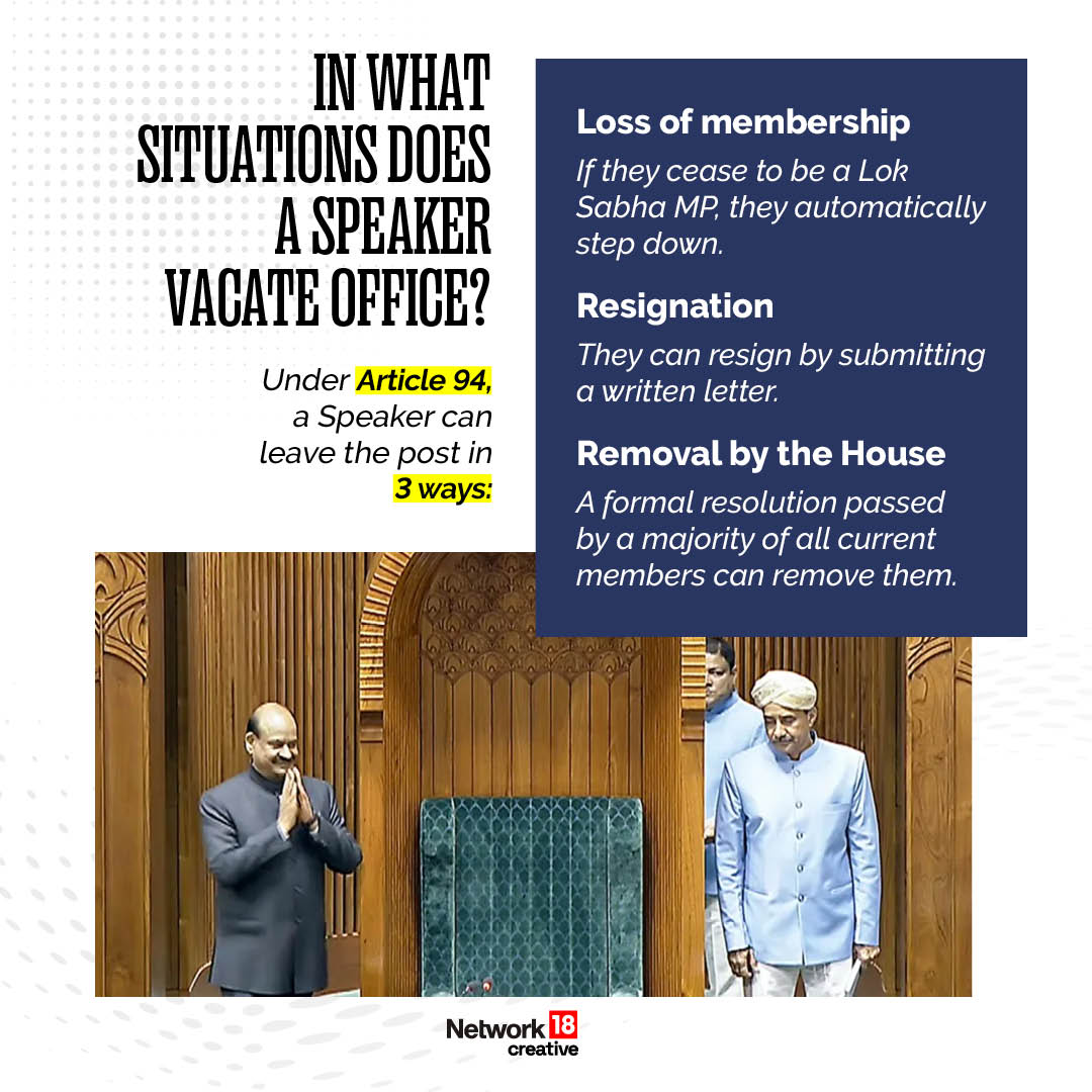 Under Article 94, the Speaker vacates office if he or she is removed by a resolution of the Lok Sabha passed by a majority of all the then members of the House.