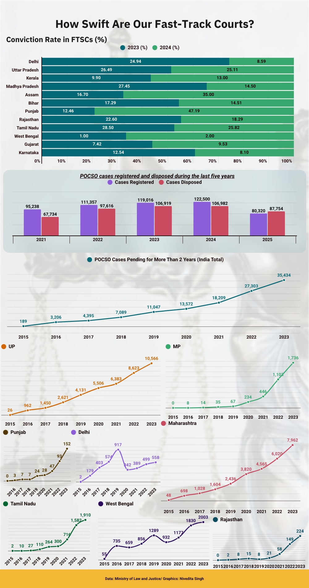 As per the National Judicial Data Grid figures up to December 2025, there are 35,434 cases filed under POCSO Act pending for over two years—up from 189 in 2015.