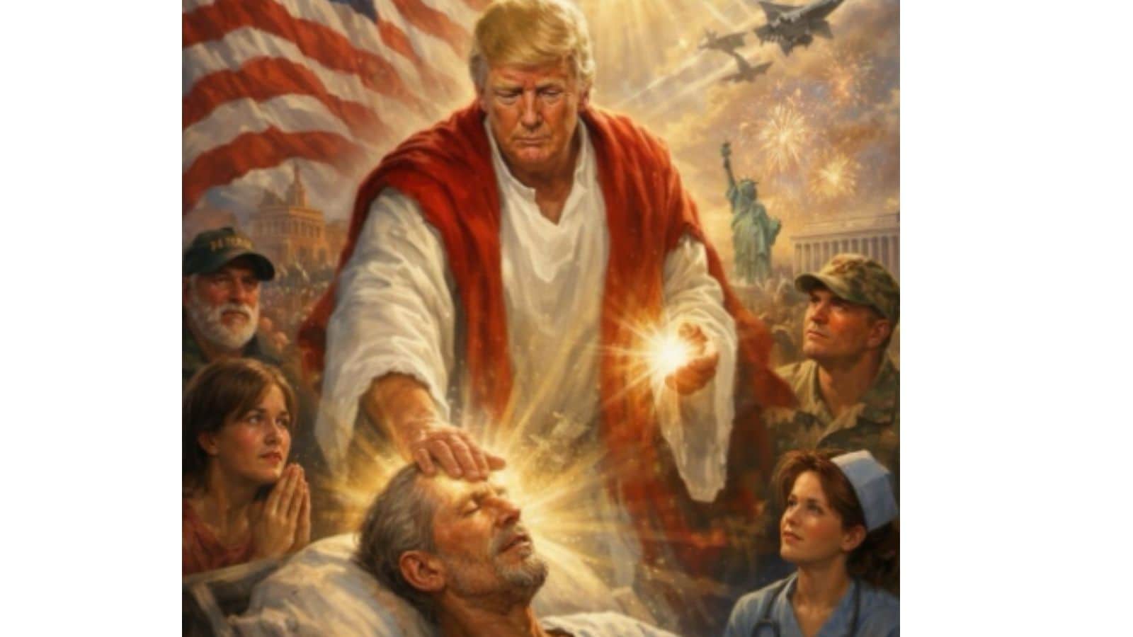 US President Donald Trump shared an AI-generated photo showing him wearing a white robe with a red drape, placing one hand on the head of an elderly man lying in a hospital bed. A glowing light is shown in his other hand, directed toward the man. (Donald Trump/Truth Social)