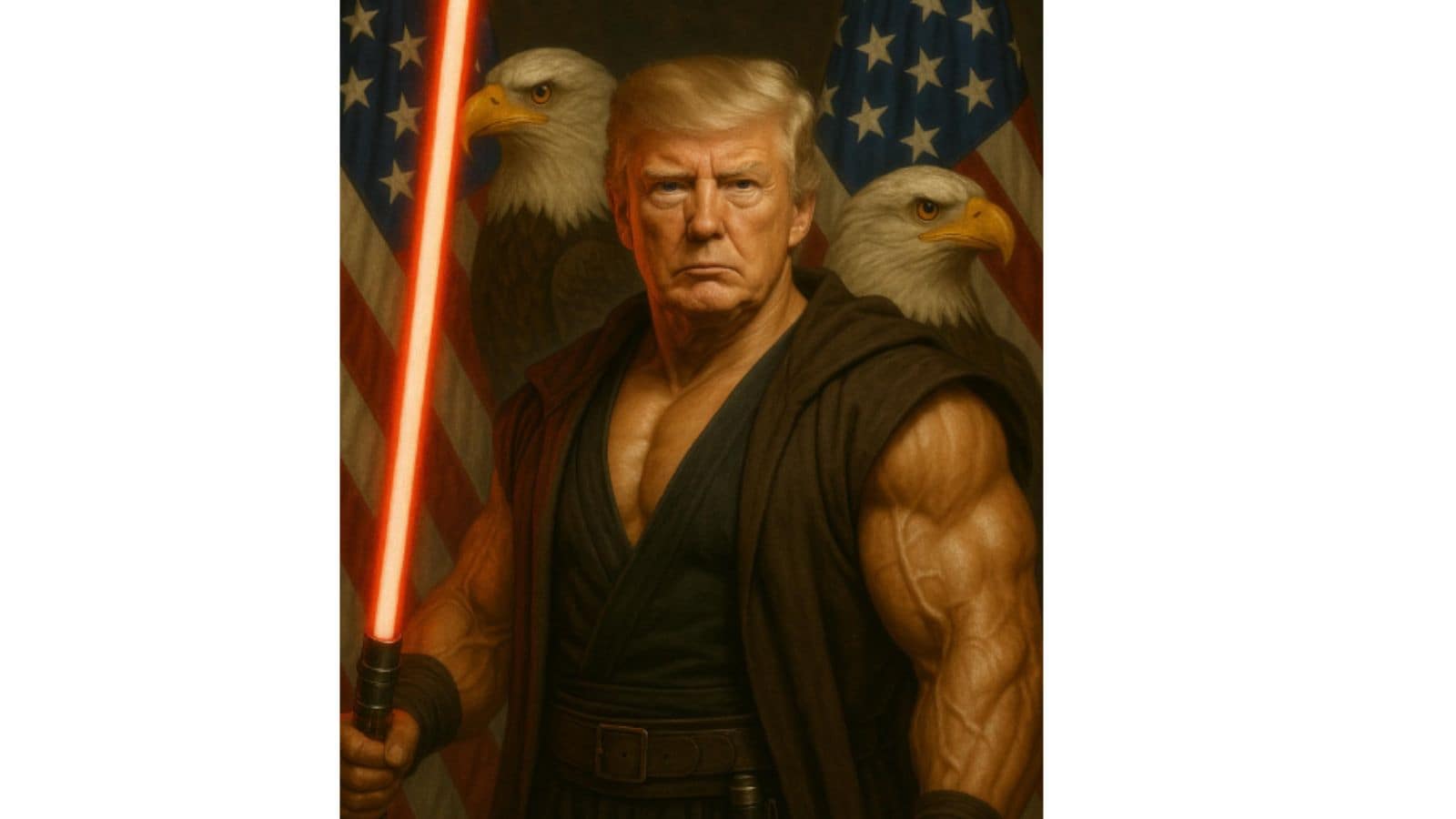 On 4 May, the White House shared a AI-photo of Trump as a jacked Jedi, lightsaber in hand, garlanded by flags and eagles. (White House/X)