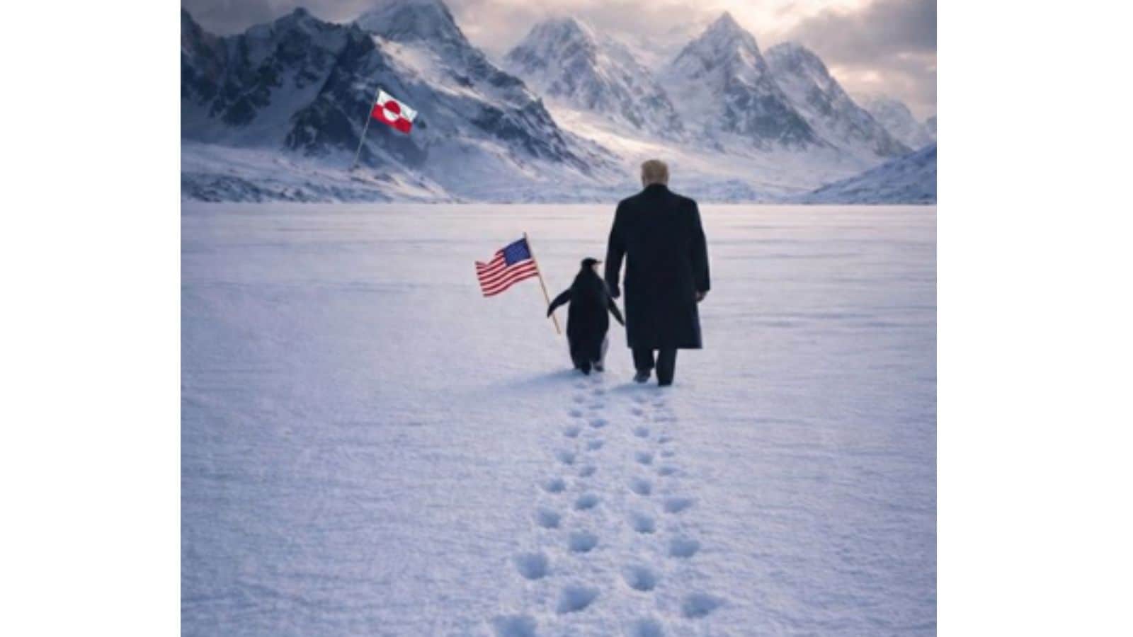 On January 23 this year, the White House shared an AI-generated image depicting Trump walking beside a penguin toward a frozen mountain range. (White House/X)