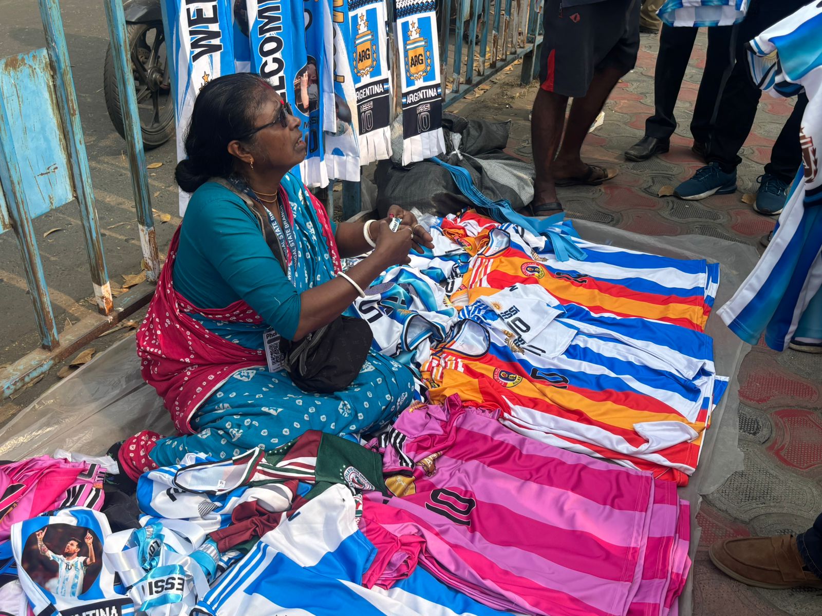 Alongside the ticket rush, merchandise sales have also picked up outside the stadium. An elderly woman selling Messi T-shirts said, “Messi, the football God, is coming. People are coming and buying these T-shirts. I am selling them for Rs 300. Not just T-shirts—you will get Messi bands, headbands, everything here."