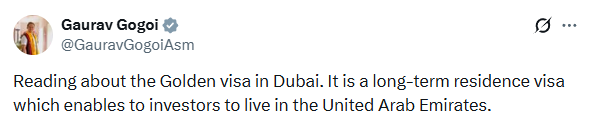 In a post on X, Gogoi wrote, “Reading about the Golden visa in Dubai. It is a long-term residence visa which enables investors to live in the United Arab Emirates."