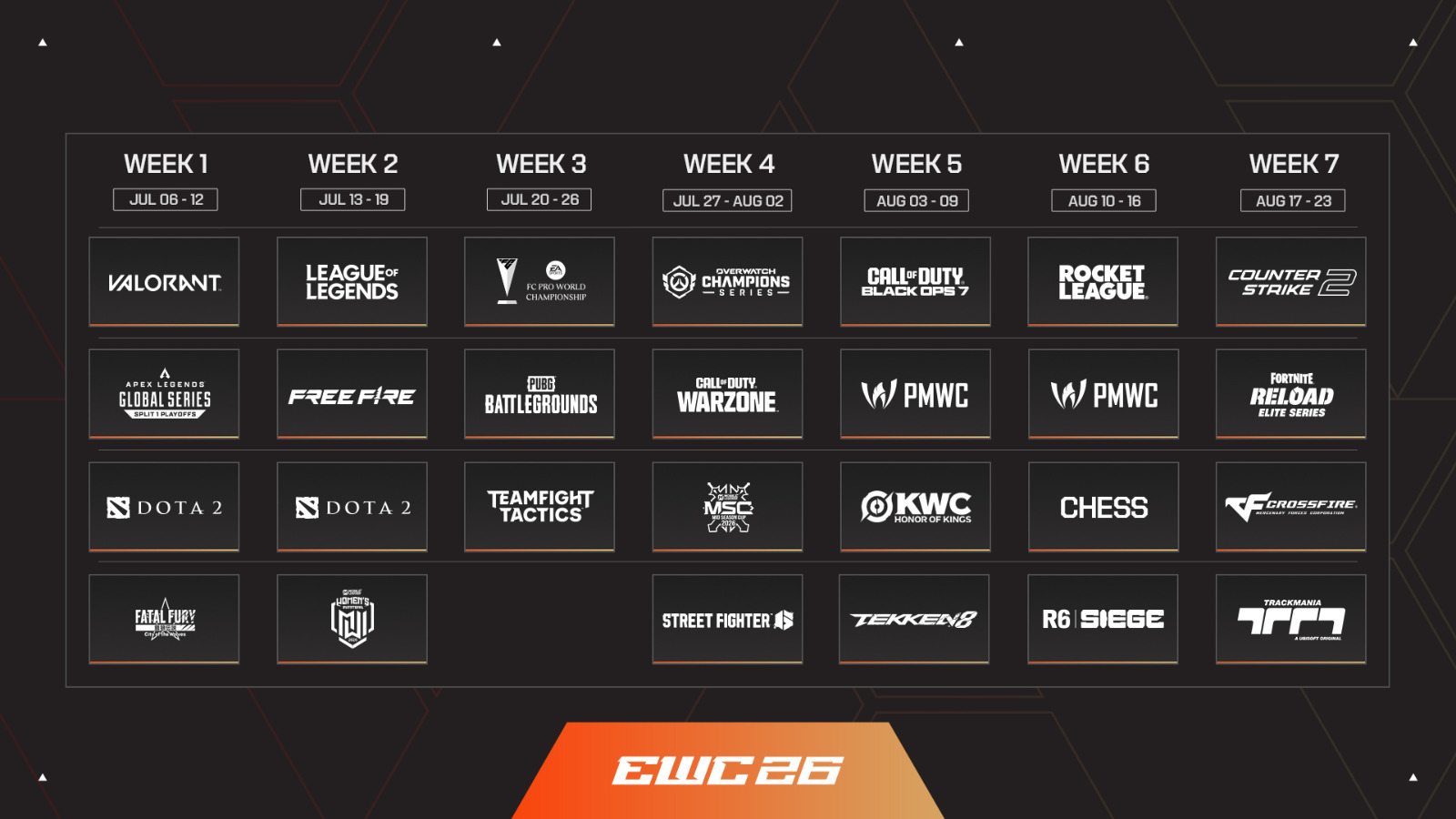 Twenty-four competitive titles, including new additions Fortnite and Trackmania, will showcase the best Clubs, players, and talent the esports world has to offer on stage at EWC 2026 in Riyadh this summer. The EWC 2026 game lineup features: Apex Legends, Call of Duty: Black Ops 7, Call of Duty: Warzone, Chess, Counter-Strike 2, Crossfire, Dota 2, EA Sports FC 26, FATAL FURY: City of the Wolves, Fortnite, Free Fire, Honor of Kings, League of Legends, Mobile Legends: Bang Bang, Overwatch 2, PUBG: Battlegrounds, PUBG Mobile, Rocket League, Street Fighter 6, Teamfight Tactics, TEKKEN 8, Tom Clancy’s Rainbow Six Siege X, Trackmania, and VALORANT.
