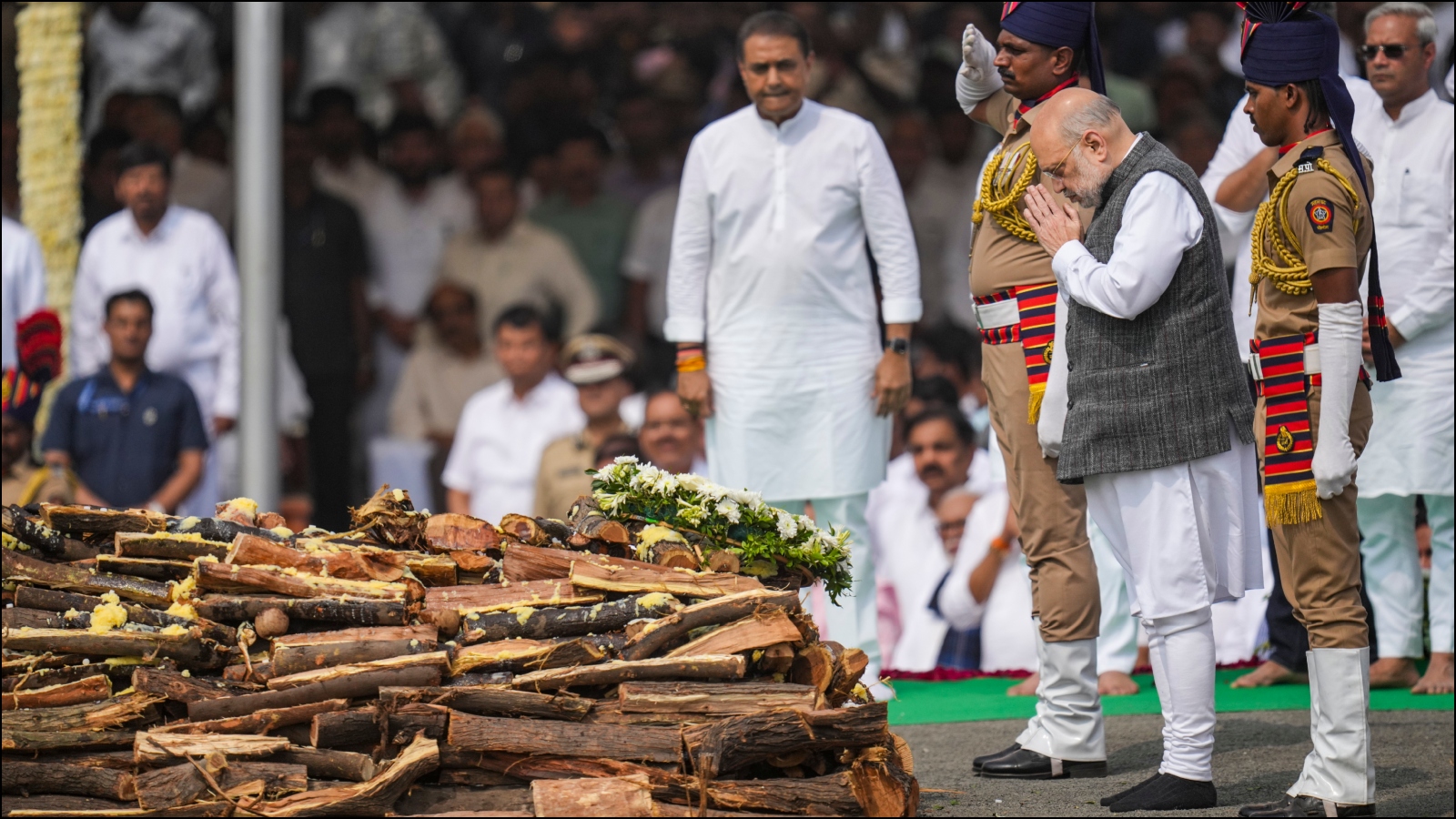 Union Minister Amit Shah, BJP National President Nitin Nabin, Goa Chief Minister Pramod Sawant, and Tamil Nadu Chief Minister MK Stalin were also present at the cremation ground to pay their last respects.