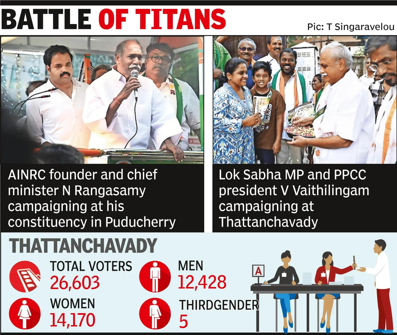 DMK, a crucial partner, has remained largely passive, forcing Vaithilingam to rely almost entirely on his personal influence and Congress machinery.Rangasamy wants to capitalize on the visible cracks within INDIA bloc. He is portraying the opposition as a "confused house" incapable of providing stable governance.Meanwhile, Vaithilingam focuses on the alleged failures of govt. "The recent fake drug manufacturing scandal, the lack of development in Thattanchavady's industrial estate, and Union govt's delay in granting statehood show the inefficiency of the govt,'' says a Congress leader.Political analyst Vai Bala, alias V Balasubramanian, said AINRC could have contested independently, without aligning with BJP, to gain greater mileage. "This time it will be tough for Rangasamy. He is facing a Congress heavyweight in his own bastion. Rangasamy could not fulfil the demands of people seeking employment for the past 10 years and there is an anti-incumbency wave," he said.