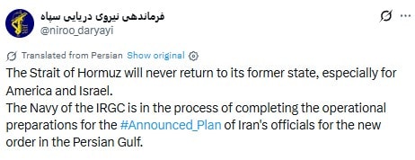 “The Navy of the IRGC is in the process of completing the operational preparations for the #Announced_Plan of Iran’s officials for the new order in the Persian Gulf (sic)," the tweet further read.
