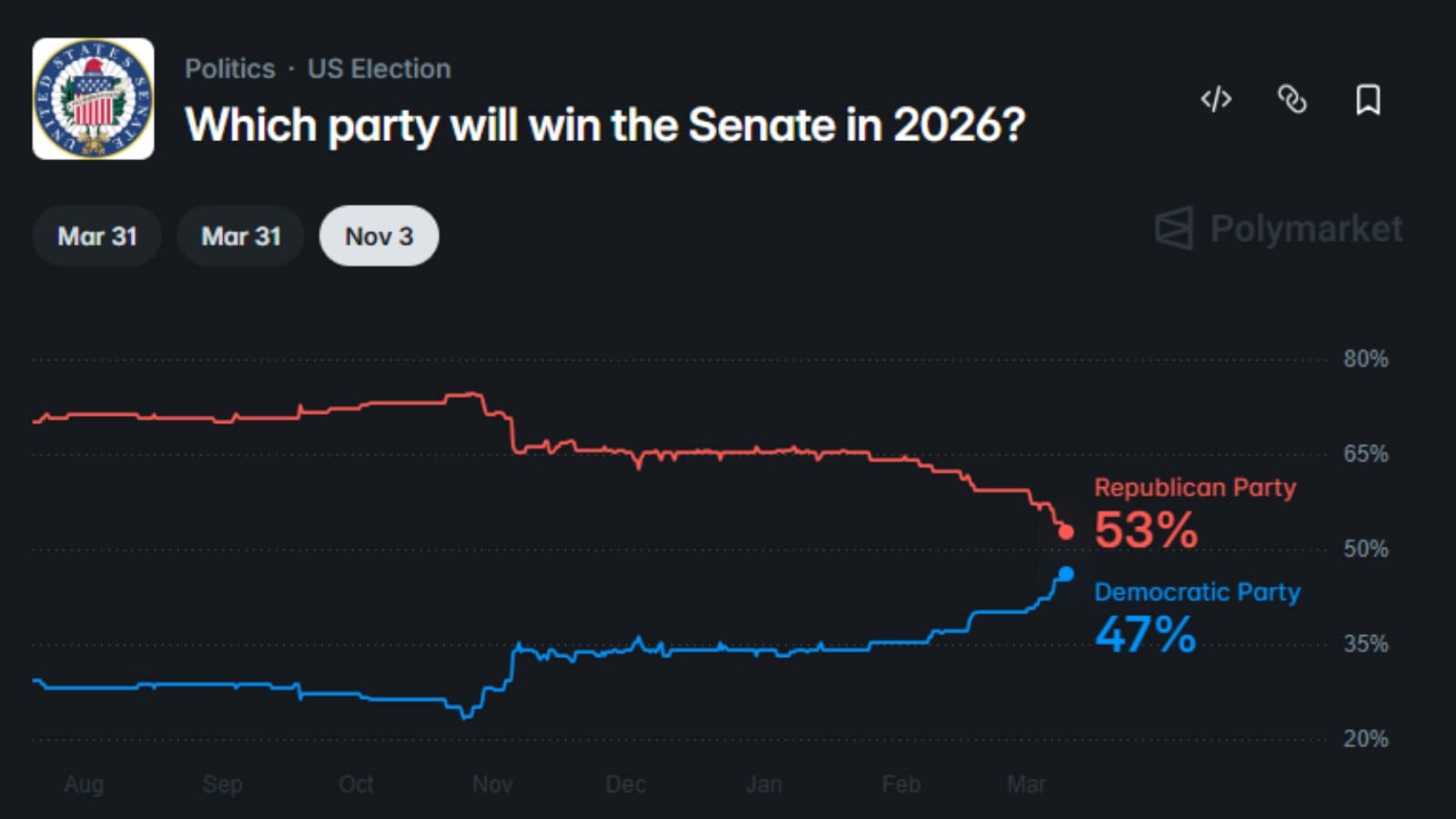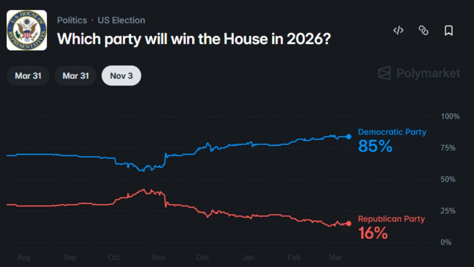 According to a prediction on the Polymarket website, the odds of Democrats have reached a new high of 47%, as compared to the chances of Republicans at 53%. The odds for Democrats have surged since the US and Israel launched the war against Iran on February 28.
