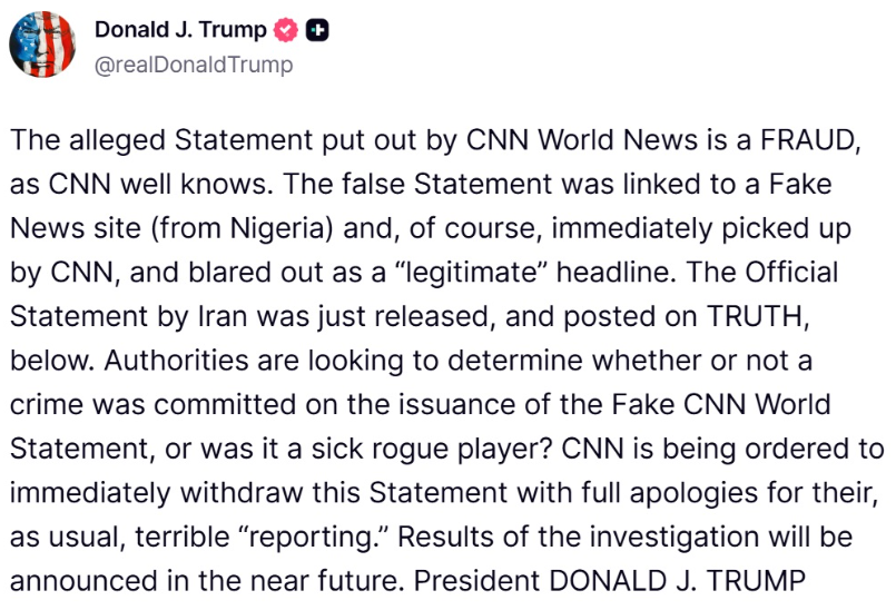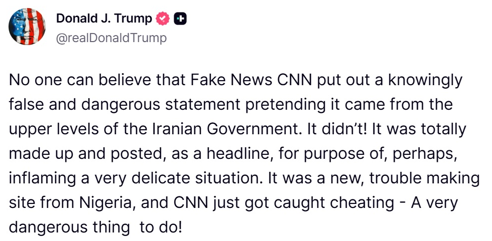 Donald Trump has accused CNN of publishing a false statement attributed to Iranian officials, calling the report “dangerous” and demanding a withdrawal.