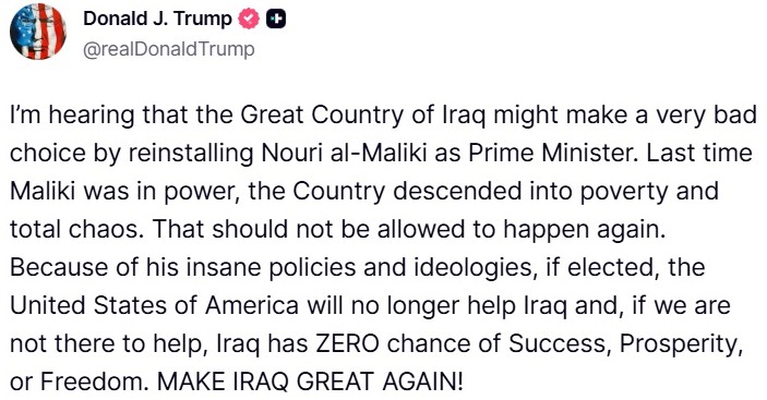 In a post on his Truth Social platform, Trump wrote, “I’m hearing that the Great Country of Iraq might make a very bad choice by reinstalling Nouri al-Maliki as Prime Minister."