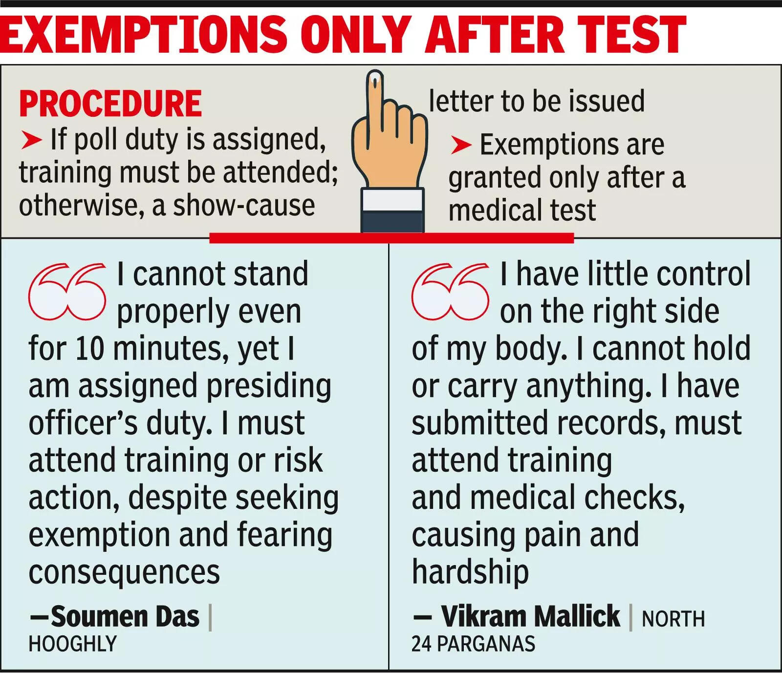 KOLKATA: With no clear directive on poll duties for physically challenged persons, the EC on Thursday said exemption pleas would be considered only after medical check-ups. Many such persons have sought exemption but have, for now, been asked to attend poll training.Sandip Ghosh, a physically challenged schoolteacher from Hooghly's Khanakul, has been asked to attend training on Saturday at Arambagh Boys' School. He said that despite declaring his disability before every election, he is repeatedly assigned poll duty and made to undergo medical tests each time."My left side is semi-paralysed, and I cannot hold or carry anything. I have been assigned duty as a presiding officer, which I cannot perform.